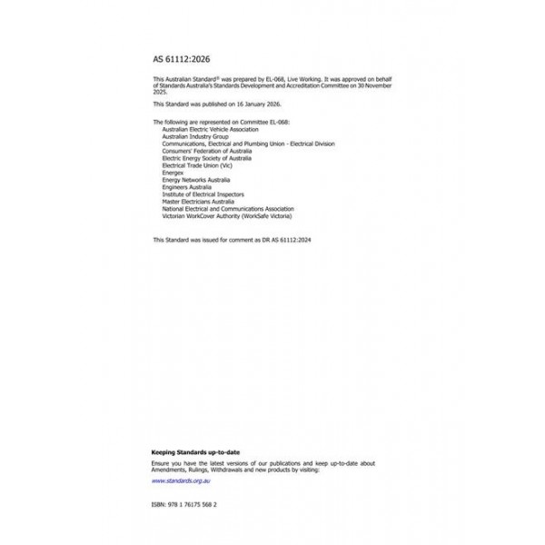 AS 61112:2026 adopts and modifies IEC 61112:2009 which specifies electrical insulating blankets for the protection of workers from accidental contact with live or earthed electrical conductors, apparatus or circuits and avoidance of short circuits on electrical installations.