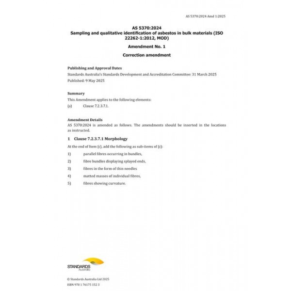 AS 5370:2024 Amd 1:2025 Sampling and qualitative identification of asbestos in bulk materials (ISO 22262-1:2012, MOD)