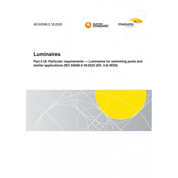 AS 60598.2.18:2025 adopts and modifies IEC 60598-2-18:2022, which specifies requirements for fixed luminaires intended for use in, or in contact with, the water in, for example, the basins of swimming pools, fountains, paddling pools, and garden pools, and for use with electric light sources